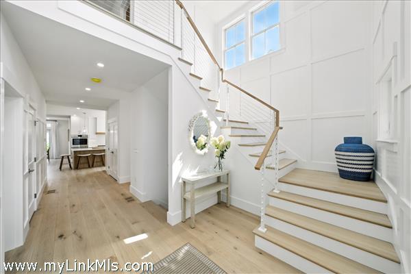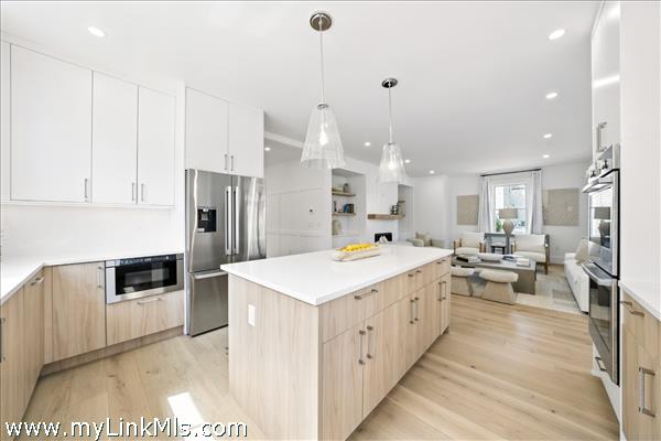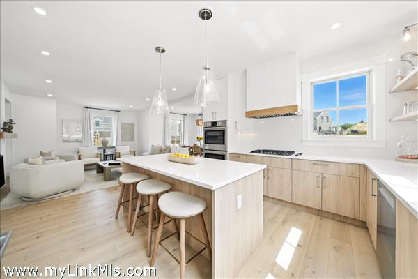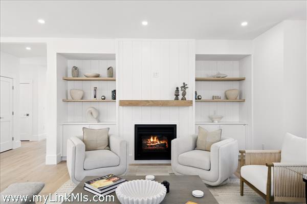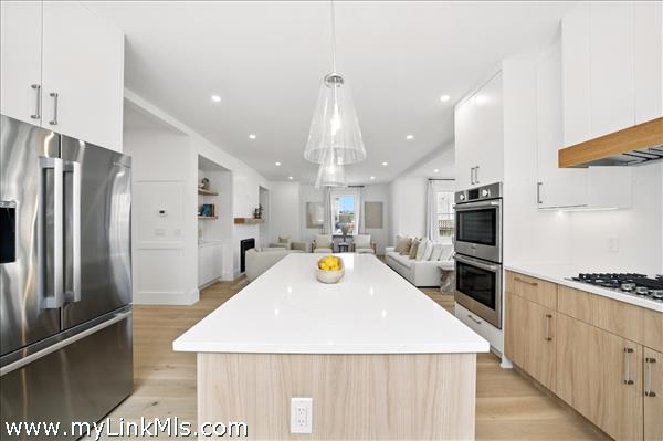 Spacious Chef's Kitchen with oversized quartz kitchen island and quartz backsplash and under cabinet lighting, Dining Room, Living Room, Mud Room, Full Bath and First floor primary suite or Den with full bath. 5 1/2" White Oak Floors, Tile in the bathrooms, 9' ceilings, fireplace, detailed moldings.